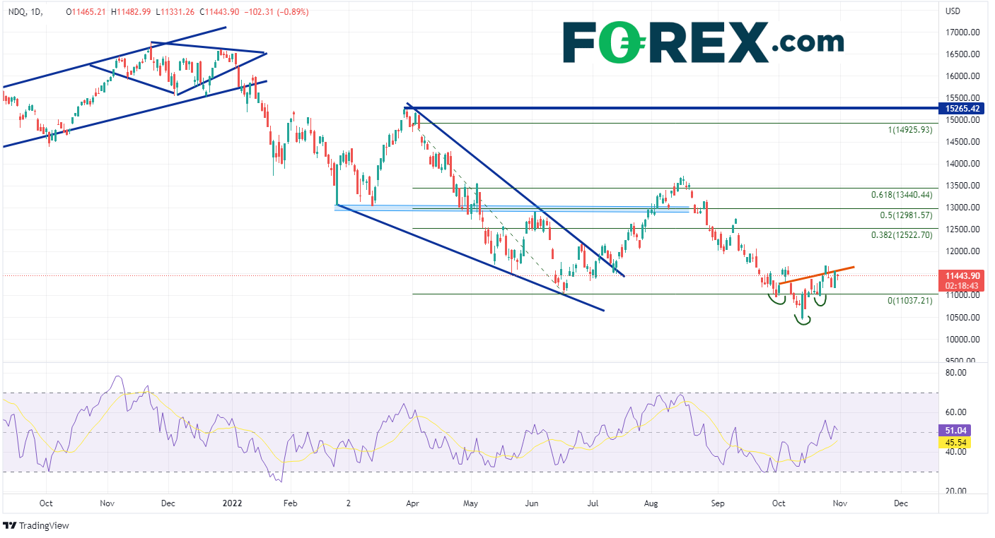 同时日线显示,纳指10020211121日创下有史以来最高点16764.86。之后,纳指100交投形成下降楔形形态,616日触底11311.05点。纳指100随后突破楔形形态,接着回落至329日高点(楔形顶点)至616日低点的61.8%回档位13720.91。在此之后,纳指100再度下探,并在1013日创下年初至今最低点10440.64随后,纳指100缓步爬升,于1025日收复近期高点11681.85