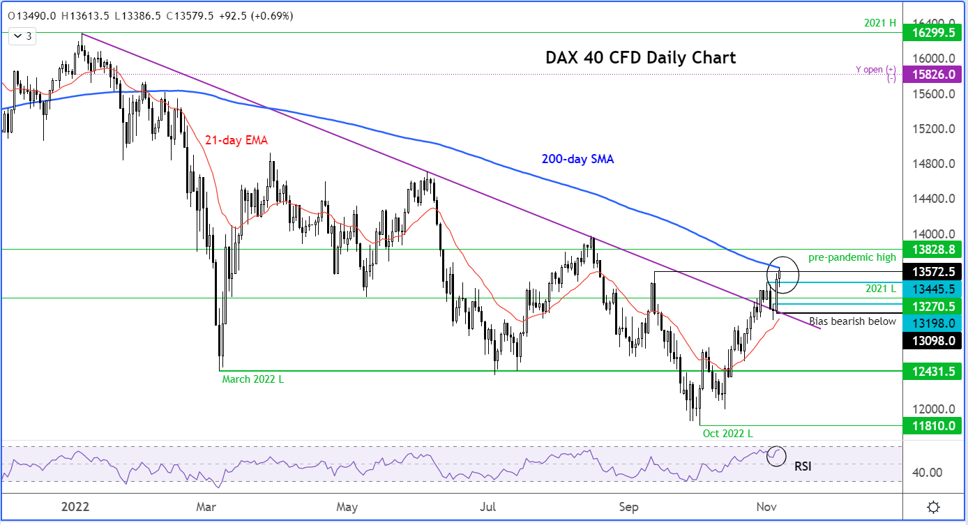 在撰写本文时,DAX13610附近考验200日均线,因此盘中仍有可能再次扭转势头。