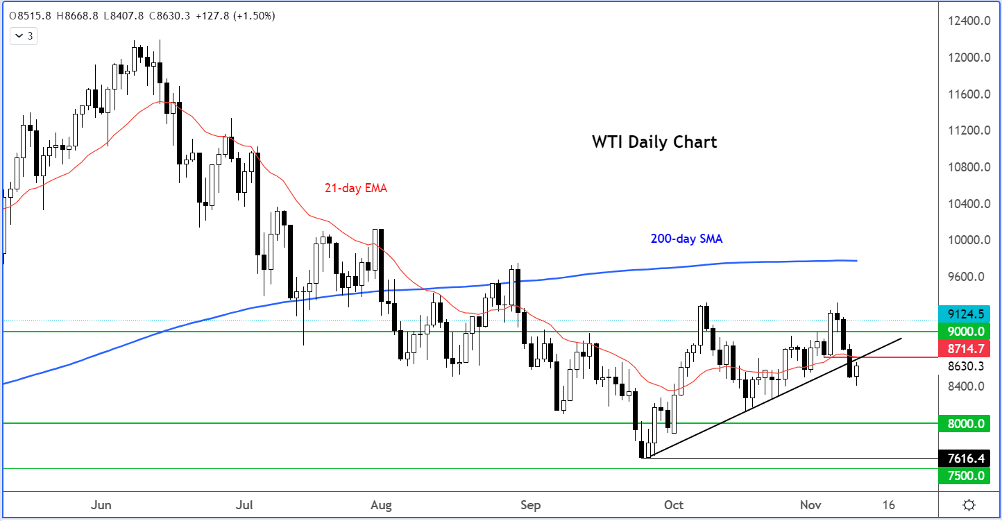 今天的美国通胀报告令市场普遍大涨,因为美联储在12月进一步加息75个基点的风险已被排除,并且降低了对最终利率的预期。7.7%的年化CPI远低于预期,较上月的8.2%大幅下降。对于密切关注通胀的投资者来说,这是个好消息。另一个好消息是最近一些能源价格下跌。原油突破这一趋势线可能会导致油价进一步下跌,从而推动通胀更大幅度地下降。