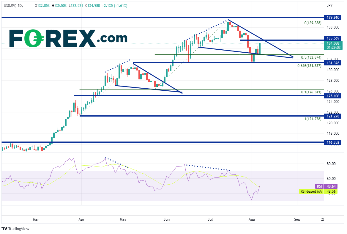 自从3月11日突破116.35,美元/日元持续大举上攻,5月9日最高到达131.33,当时RSI进入超买区域。该货币对之后盘整并形成下降楔形且回到3月31日低点到5月9日高点的50%回档位,RSI也回到中性区域。价格在5月31日上破下降楔形的上轨趋势线并再度冲高,于7月14日创下1998年以来最高点,RSI也再度超买。随后该货币对故伎重演,回撤并形成下降楔形且RSI回归中性,不同的是,这次价格击穿了50%回档位与下轨趋势线。美元/日元在8月1日跌至5月24日低点到7月14日高点行情的61.8%回档位,即131.33附近,并守于其上。价格在第二天反转且收盘回到楔形内,使得第一天的突破变成假性下破。美元/日元在8月5日非农就业数据发布后反弹200个基点,收于水平阻力位与楔形的上轨趋势线。预计价格将像5月那样击穿楔形上轨。如果本周美元继续反弹,可能带动美元/日元迅速回到139.39。