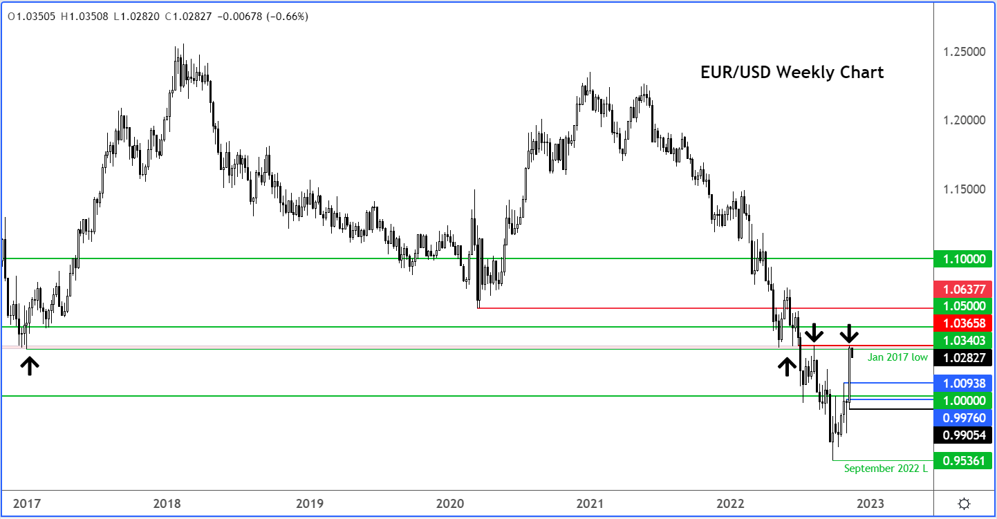 随着投资者再度将注意力转向欧洲经济局势恶化和美欧货币政策的巨大差异,欧元/美元在上周大幅回升4%,触及1.0350附近的长期阻力位。不仅欧元/美元本周进入防御态势。美联储理事沃勒(Christopher Waller)指出距离暂停加息“还有很长的路要走”,鹰派措辞很可能刺激美元反弹。黄金和美元指数期货因此承压,而美元/日元自上周五低点上抬200点。