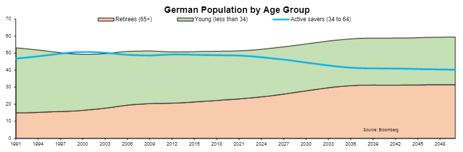 其次,西方经济体获得了前所未有的人口储蓄红利。婴儿潮一代中间的人生于1955年(1946-1964年出生的这一代人的中点,也是美国历史上活产率最高的时期),1995年40岁,2005年50岁,2015年60岁。根据生命周期理论,随着大家庭组建支出完成,人们40岁左右会成为净储蓄者。储蓄会随工资增加而增加,在工人50多岁时成为空巢老人时见顶。这种人口储蓄红利在战后欧洲尤其大,因为战争期间死亡率飙升,出生率在婴儿潮期间激增,又在70年代口服避孕药普及后暴跌。婴儿潮一代人口数异常庞大,且几乎没有父母或孩子需要照顾。在德国,主要储蓄者(34至64岁)与净消费者(退休人员或年轻人)的比率2002年达峰。