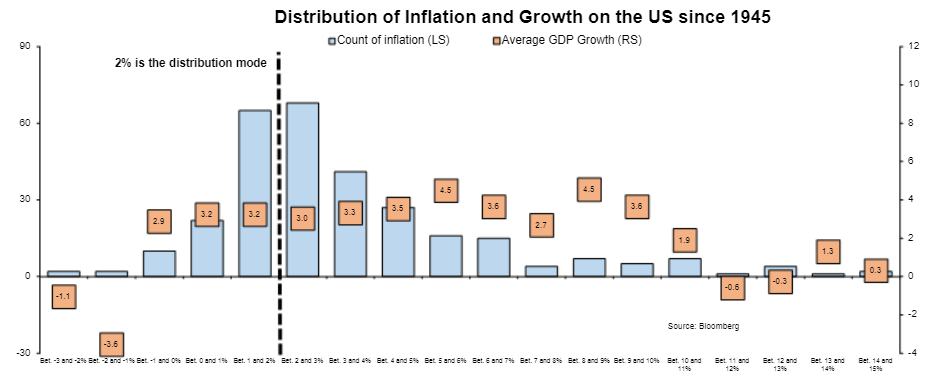 回顾美国自1945年以来的季度通胀水平,2%确实是常见分部水平,但通胀率通常波动性较大,没有证据显示2%的通胀率能够引领经济卓越增长。