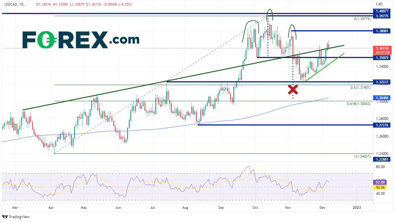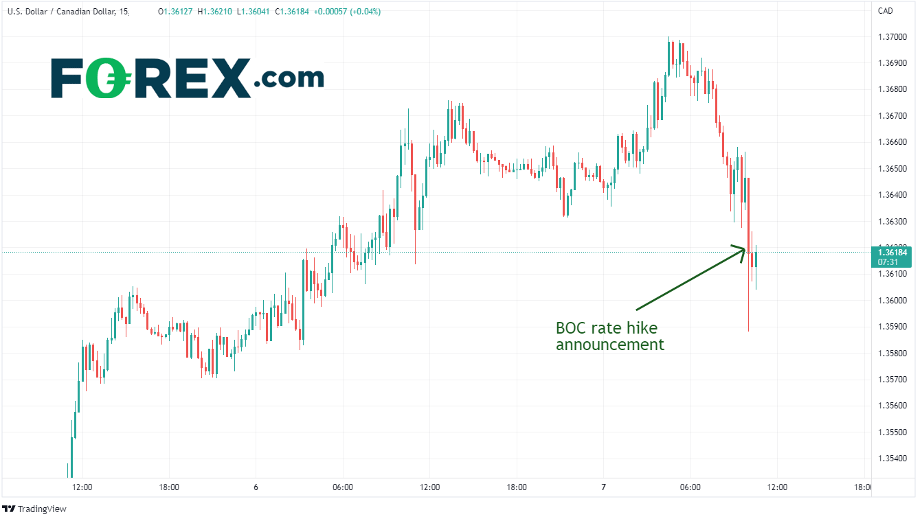 尽管美元/加元在过去几周一直走高,但该货币对在加拿大央行的决定后持续走低。宣布加息50个基点后,美元/加元就从1.3646跌至1.3588,尽管声明的基调略显鸽派。这可能归咎为买入谣言,卖出事实的规律。