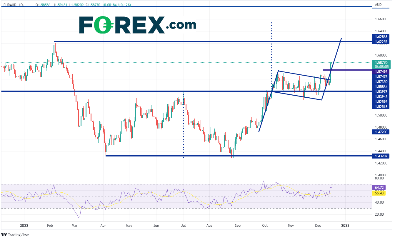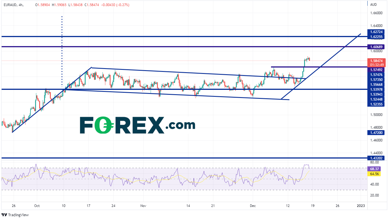 由于欧洲央行的鹰派立场和澳洲联储“不那么鹰派”的言论,欧元/澳元走高。在日线图上,欧元/澳元在2月4日创下了年内高点1.6226。该货币对随后大幅走低,并在4月5日触及1.4320。在整个夏季反弹至1.5398之后,该货币对再次下跌,并在8月25日测试了之前的低点,建立了潜在的双底。欧元/澳元再次反弹,并于10月10日在1.5397附近创下4月5日以来的高点。这次突破在1.6550附近设定了双底的目标位。突破后,欧元/澳元以旗形盘整,等待下一个促成涨势的催化剂。在周四表现强势的欧洲央行似乎就是一例。