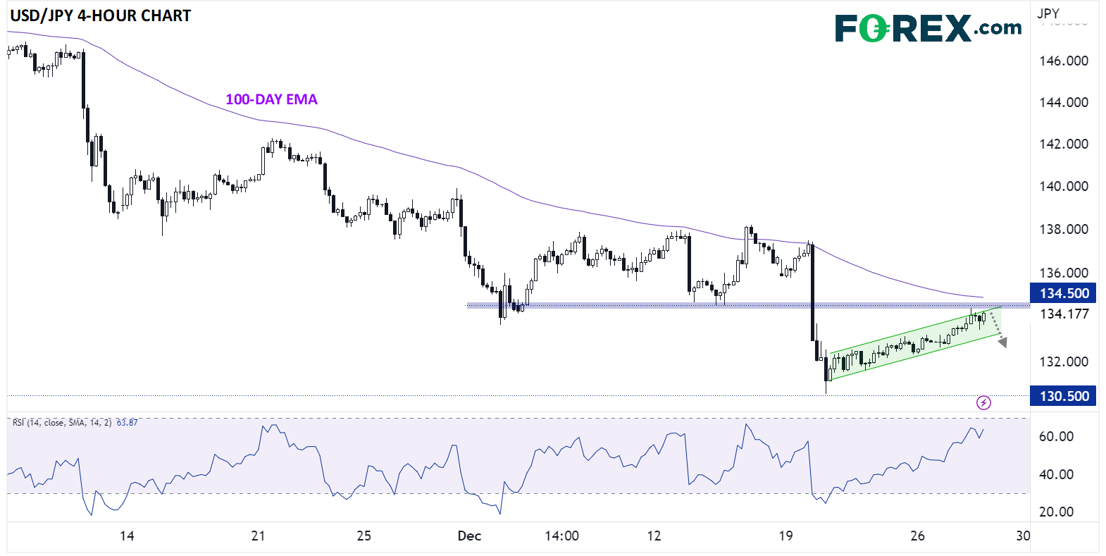 在最初宣布之后,日元兑所有主要货币都不出意料地飙升,但自那之后,该货币在寡淡、低流动性的假期交易期间逐渐回吐了部分涨幅。正如下面的4小时美元/日元图表所示,该货币对正在接近之前从支撑位转化而来的阻力位134.50区域,以及 100日均线,自11月初以来,该均线一直压制着该货币对的反弹: