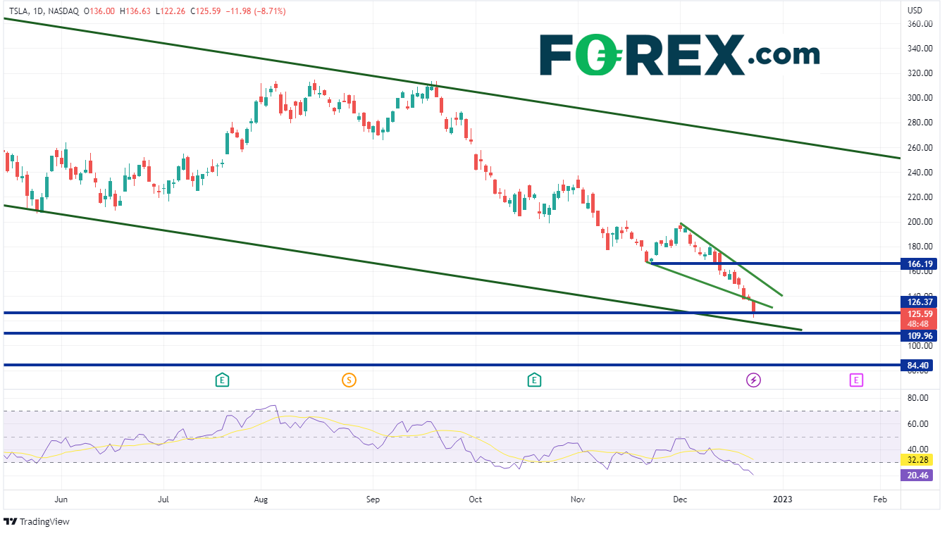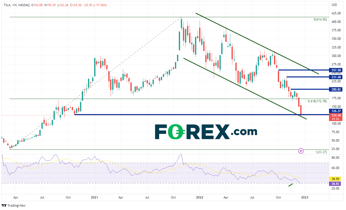 仅在12月,特斯拉股价就从197.08跌至122.26,跌幅超过36%,本月(和本年)还剩6个交易日。特斯拉股价处于2020年9月以来的最低水平。在周线图上,从上周开始,特斯拉股价大幅跌破2020年3月大流行低点至2021年11月历史高点区间的61.8%斐波那契线172.78附近。价格目前正在测试该股自历史高点以来所处的下行通道下沿。