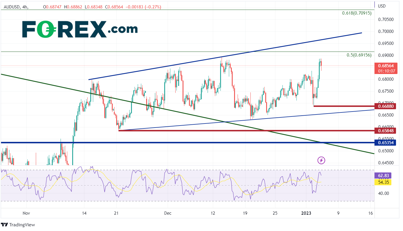 从4小时图上看,在突破长期下降通道(绿色线)后,澳元/美元在2022年50%回档位附近形成新通道,缓步上升。由此向上遇到的第一个阻力位将落在0.6915,随后会在新通道上轨0.6968附近遇阻。如果货币对价格由此继续走高,将在61.8%回档位附近的 0.7092遇到第三个阻力位。如果阻力位守关成功,澳元/美元未能向上突破通道,转而下跌,则可在1月3日低点0.6688找到第一个支撑位。继续向下,价格可能抵达新通道下轨0.6652附近,最后在11月22日的0.6585高点找到支撑。