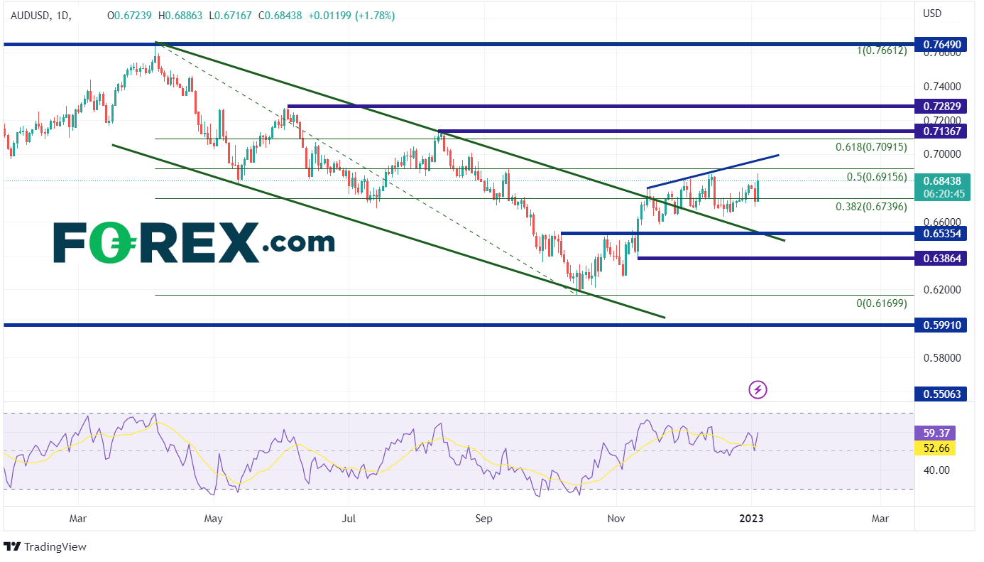 FOMC会议纪要尚未公布,外汇市场颇为平静,但澳元/美元波幅达170点,日内高点0.6886。货币对自2022年4月5日创下高点0.7661起,即沿下降通道跌落,后在2022年10月13日下探低点0.6170。自此,澳元/美元节节攀升,在11月中旬突破通道上轨,随后货币对收复2022年高点至2022年低点50%回档位,年终报收于0.6815附近。