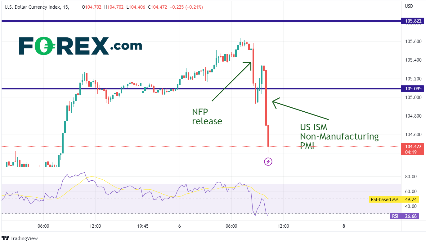 聚焦平均时薪部分的市场视就业数据有利于鸽派。此外,在就业报告发布后不久,美国公布了ISM非制造业PMI数据,该数据自20205月以来首次收缩。制造业和非制造业PMI价格部分也低于预期。美元因今日数据下跌。在就业数据发布后,美元指数最初从105.53跌至104.93。随后短暂反弹,但在美国ISM非制造业PMI公布后继续走低,从105.29跌至104.41
