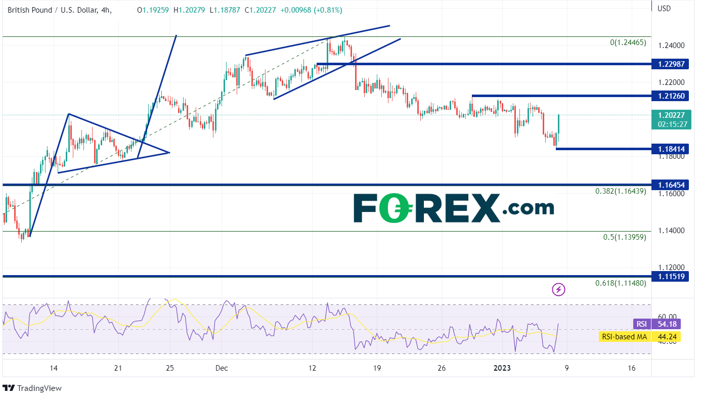 240分钟图上,英镑/美元自20221214日创下局部高点1.2447以来持续走低。该货币对在1215日跌破上升楔形的底部趋势线,原因是FOMC会议展现鹰派立场。英镑/美元继续下跌,今天创下近期低点1.1858,随后反弹至1.2017。如果该货币对要继续走高,它必须首先突破水平阻力位1.21261.2299。在此之上,价格可能会移动到20221214日的高点1.2447。然而,如果美元走强,英镑/美元走低,第一个支撑位于今天的低点1.1858。在此之下,该货币对可能会跌至从2022926日的低点到20221214日的高点区间的38.2%斐波那契回撤位1.1644,然后是同一区间的50%回撤位1.1396