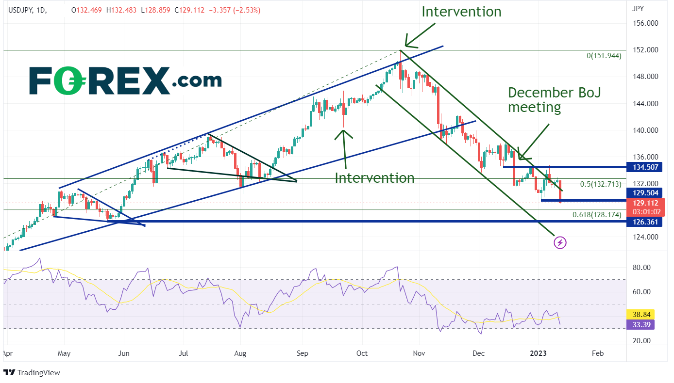 在12月的日本央行会议之后,美元/日元下跌了500多点,延续了该货币对从10月的高点稳步下行的走势。今日内下跌超过330点。在12月美国CPI再次走低后,美元/日元继续遭到抛售。环比数据为-0.1%,这是自2020年5月以来通胀数据首次为负。此外,同比数据降至6.5%,而前值为7.1%。如果美元/日元继续走低,下一个支撑位于从2022年的低点到高点区间的61.8%斐波那契回撤位。在此之下,水平支撑位在126.36。