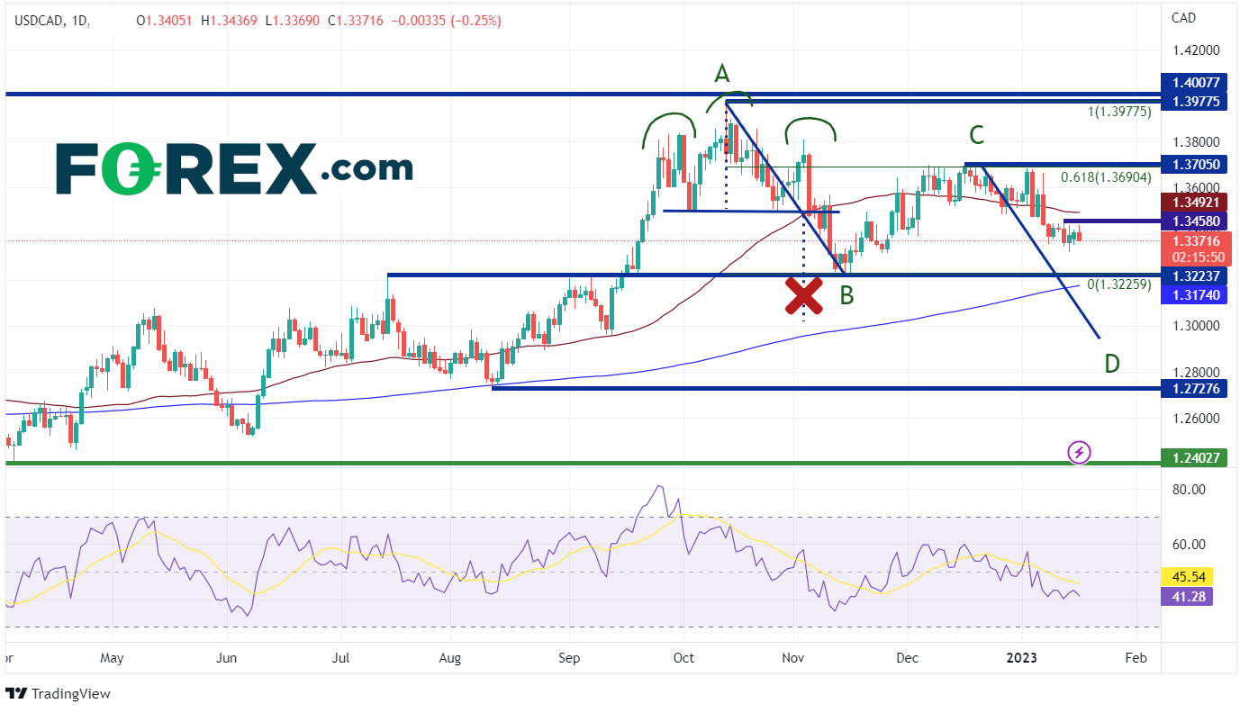 美元/加元自2022年以来缓步上涨,并在去年9月15日突破阻力位1.3223。随后,货币对快速上跳至2022年高点,在10月13日上探1.3976。货币对由此形成头肩形态,但未能成功突破实现目标。美元/加元从2022年10月13日高点反弹至61.8%斐波那契回档位,触及前支撑位1.3690,形成目前的AB=CD形态。而该形态目标接近1.2950点。