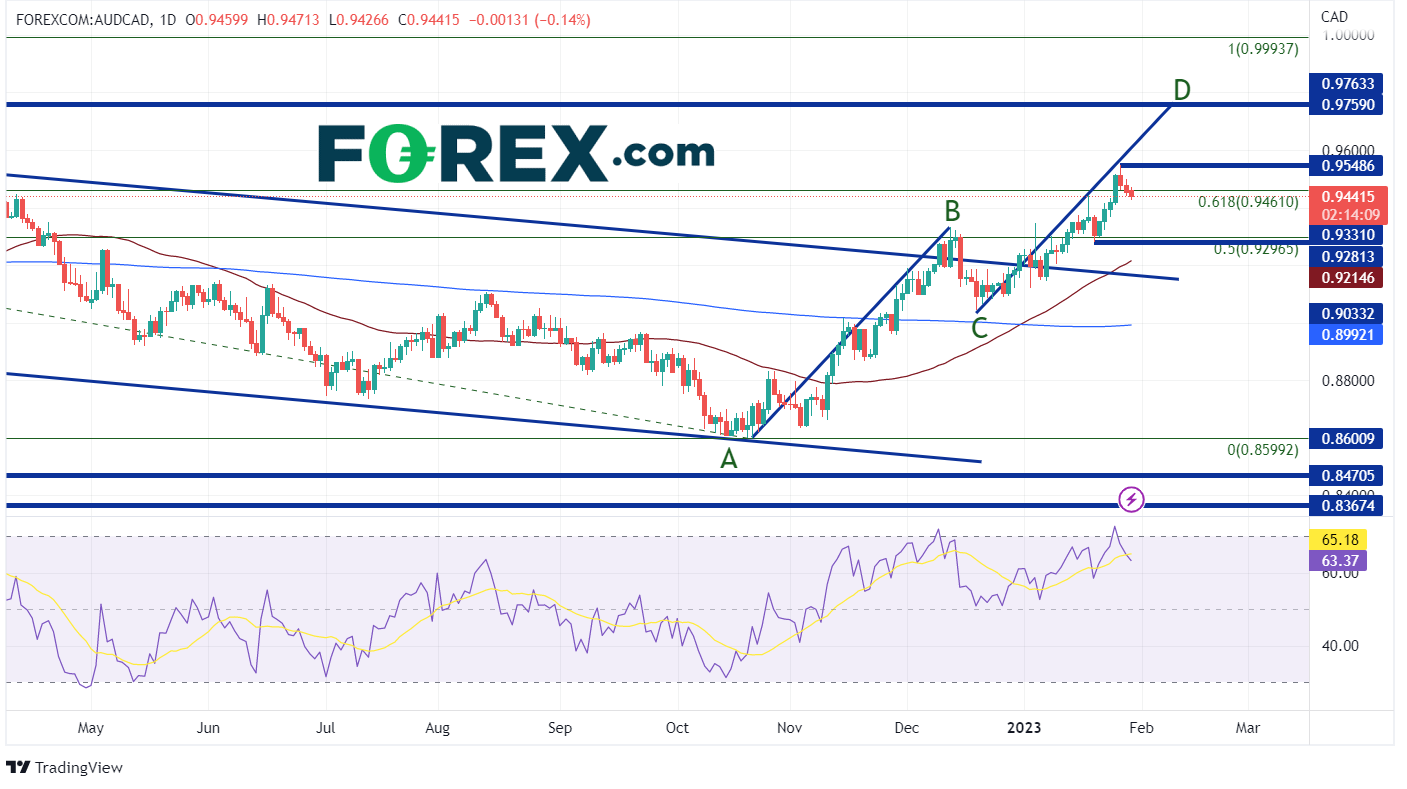 鉴于每周美元、英镑和欧元波动性较大,如果交易者想要求稳,澳元/加元是优选。2022年10月至今,货币对节节攀升,在升至2021年2月高点与2022年10月低点的61.8%斐波那契回档位后,近期出现回调。投资者不妨观望澳元/加元会否继续走高,能否上探AB=CD形态目标位0.9749。