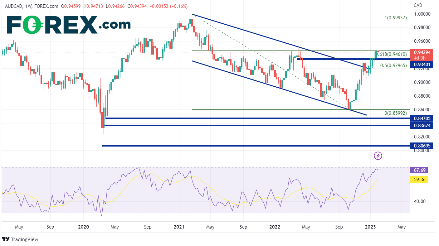 如果想要避开美元、英镑和欧元?不如关注一下澳元/加元。澳大利亚储备银行要到2月7月才举行会议,而加拿大央行上周才开过会。因此,澳元/加元波动性不会同美元、英镑和欧元一样大幅剧烈。从周线图上看,澳元/加元自触及2021年2月疫情后高点0.9994后,即进入有序下跌的通道。2022年10月,货币对下探0.8599,触及通道下轨后反弹,此后持续走高。2022年12月初,货币对一度突破通道上轨,但止步于2021年2月高点至2022年10月低点的50%回档位,接近0.9297。随后货币对临时回撤0.9043,但从2022年12月19日起一周内,澳元/加元飙升。上周,货币对上探61.8%斐波那契回档位0.9461,并在此水平交投。