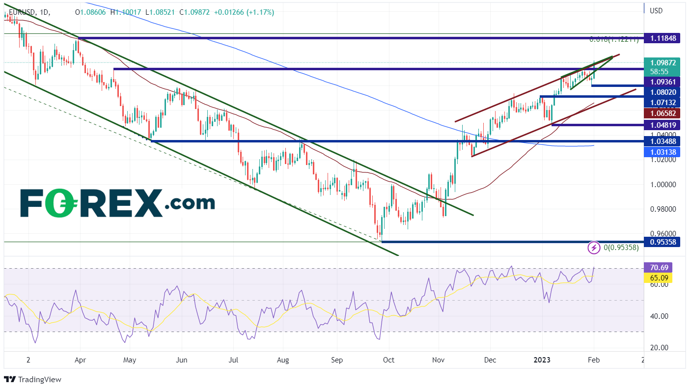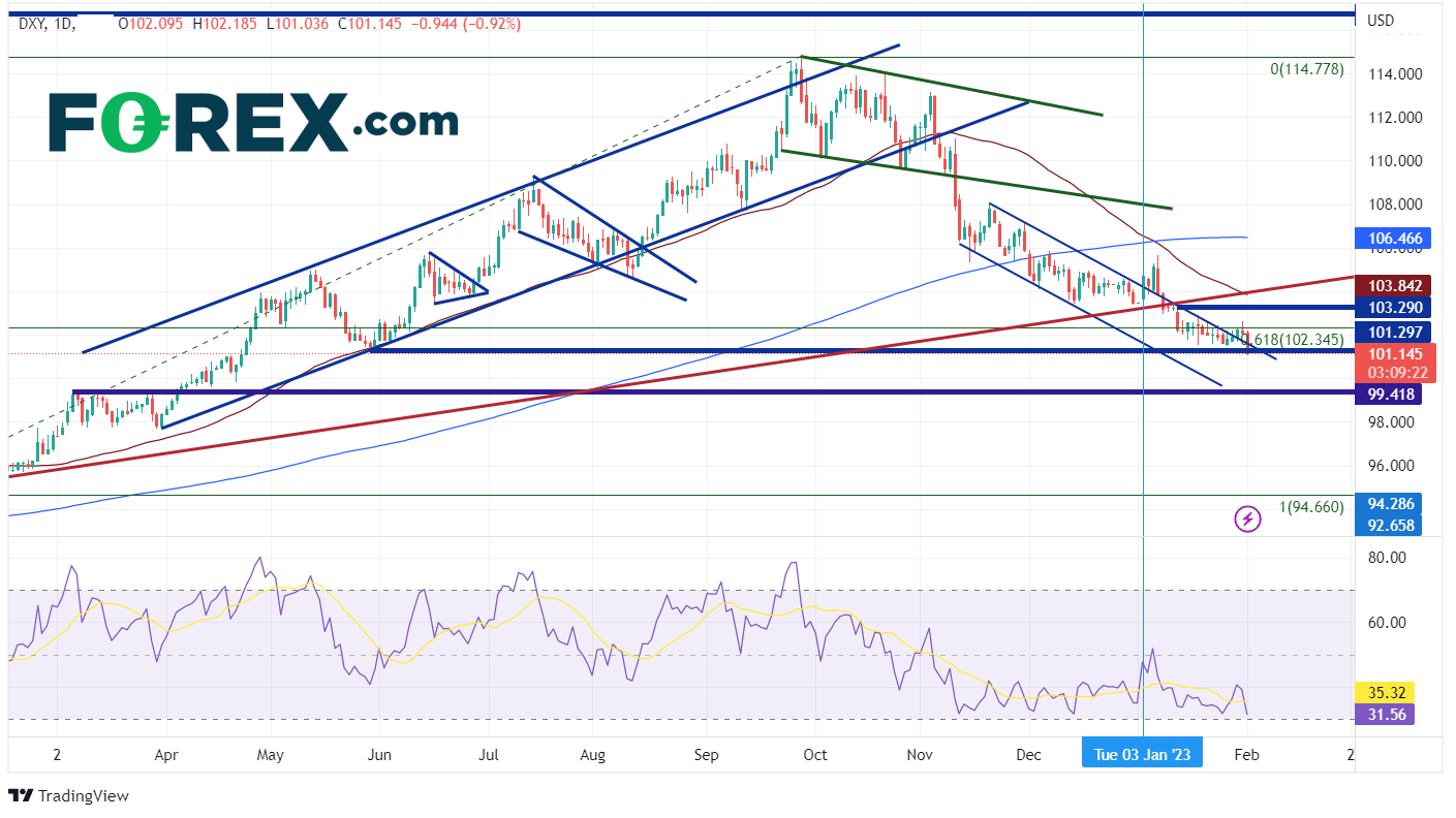 由于会议不够鹰派的言论和会前的市场定价,美元随即遭到抛售。美元指数(DXY)大幅走低,回到近期通道的顶部趋势线下方,低于2022530日的水平支撑位101.29DXY的下一个支撑位在心理整数支撑位100.00。低于该点位,价格可能会跌至20223月的支撑位99.42附近。要想扭转跌势,它得回到昨日高点102.60上方。下一阻力位于112日的高点103.29