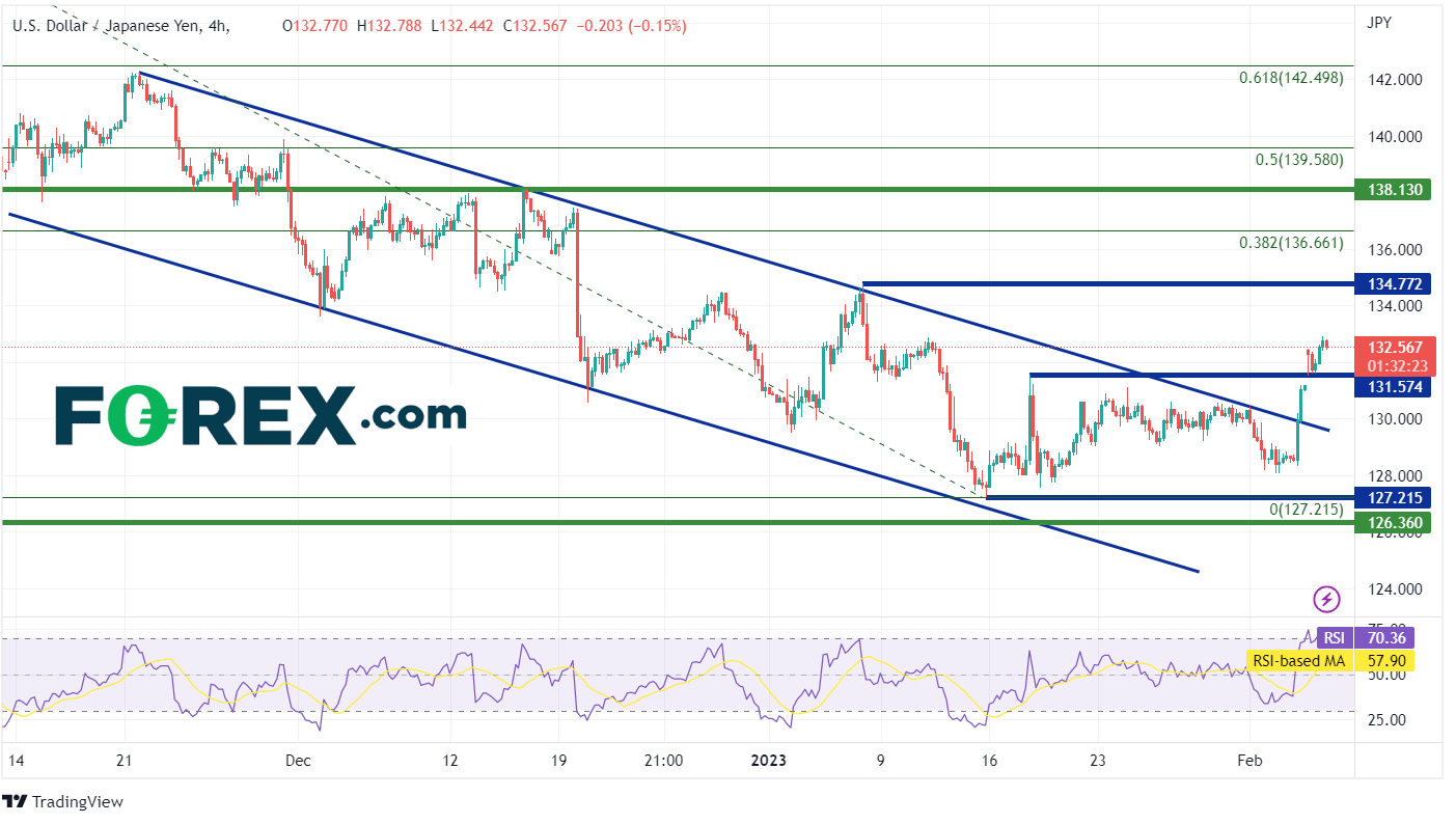 在过去的两个交易日中,美元/日元从128.33的低点移动到132.90的高点,波幅457点。该货币对会继续走高吗?只要美联储被视为鹰派或日本央行被视为鸽派,该货币对就应该会继续走高。美联储主席鲍威尔将于周二在华盛顿经济俱乐部发表讲话。多留意最近对FOMC或非农就业报告的任何澄清。请相应地管理风险。