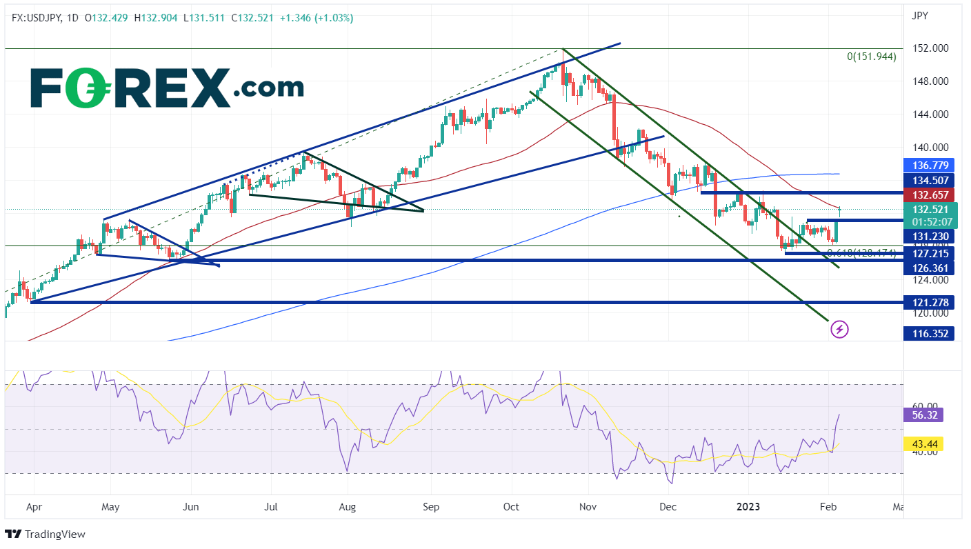 美元/日元自1021日触及20年高点151.94以来一直在走低。该货币对在通道中稳步下跌,但于116日在2022年低点到2022年高点区间的61.8%斐波那契回撤位127.22附近得到支撑。此后,美元/日元一直交投于127.31131.57的横向区间内。但在周一开盘后,该货币对跳空高开至区间上方的132.42,并交投于50日移动平均线132.65附近。