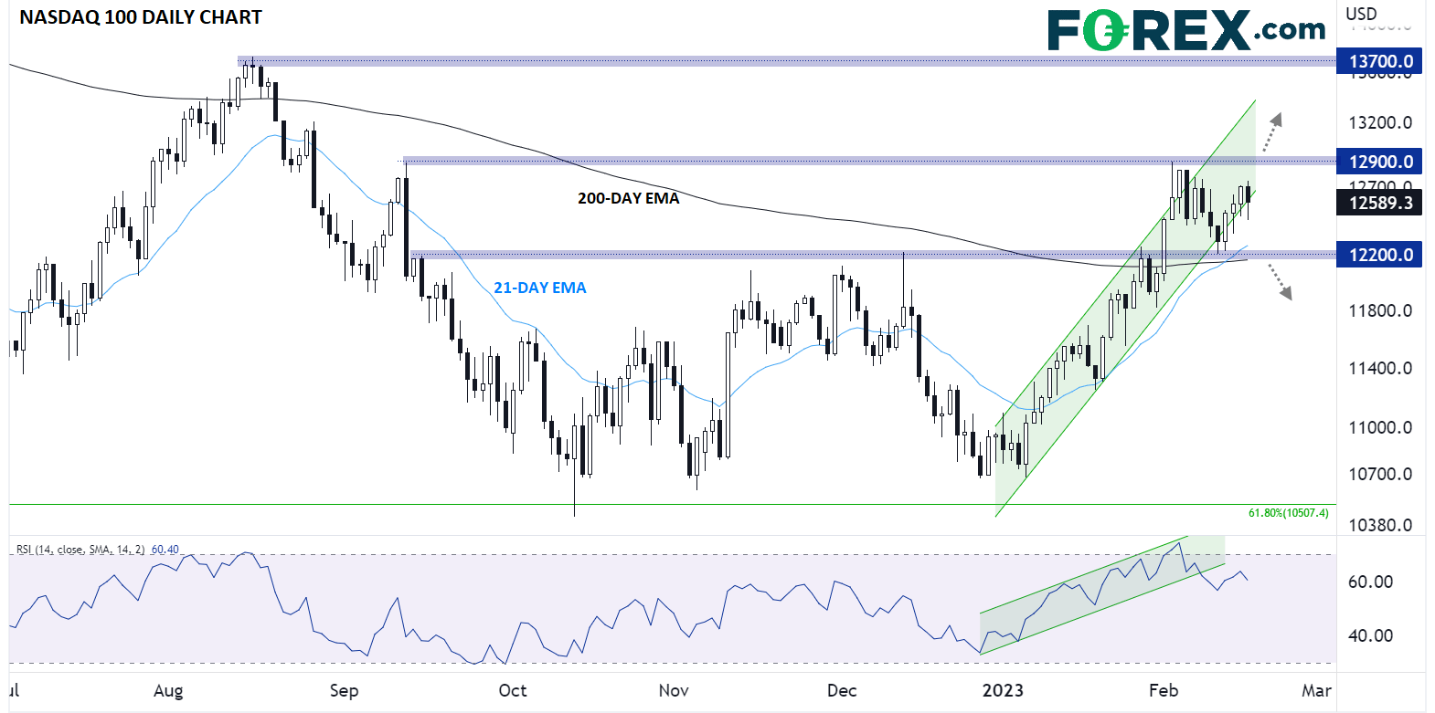 随着不着陆情景越来越可信,交易员对股市权重更大的因素存在分歧:利率上升还是经济韧性。本周的交易反映了这一点,纳斯达克100指数跳空低开后反弹,到目前为止每日收涨,因为交易员权衡了高企的价格与最近的经济和财报数据,而这些数据几乎没有显示出经济严重放缓的迹象。