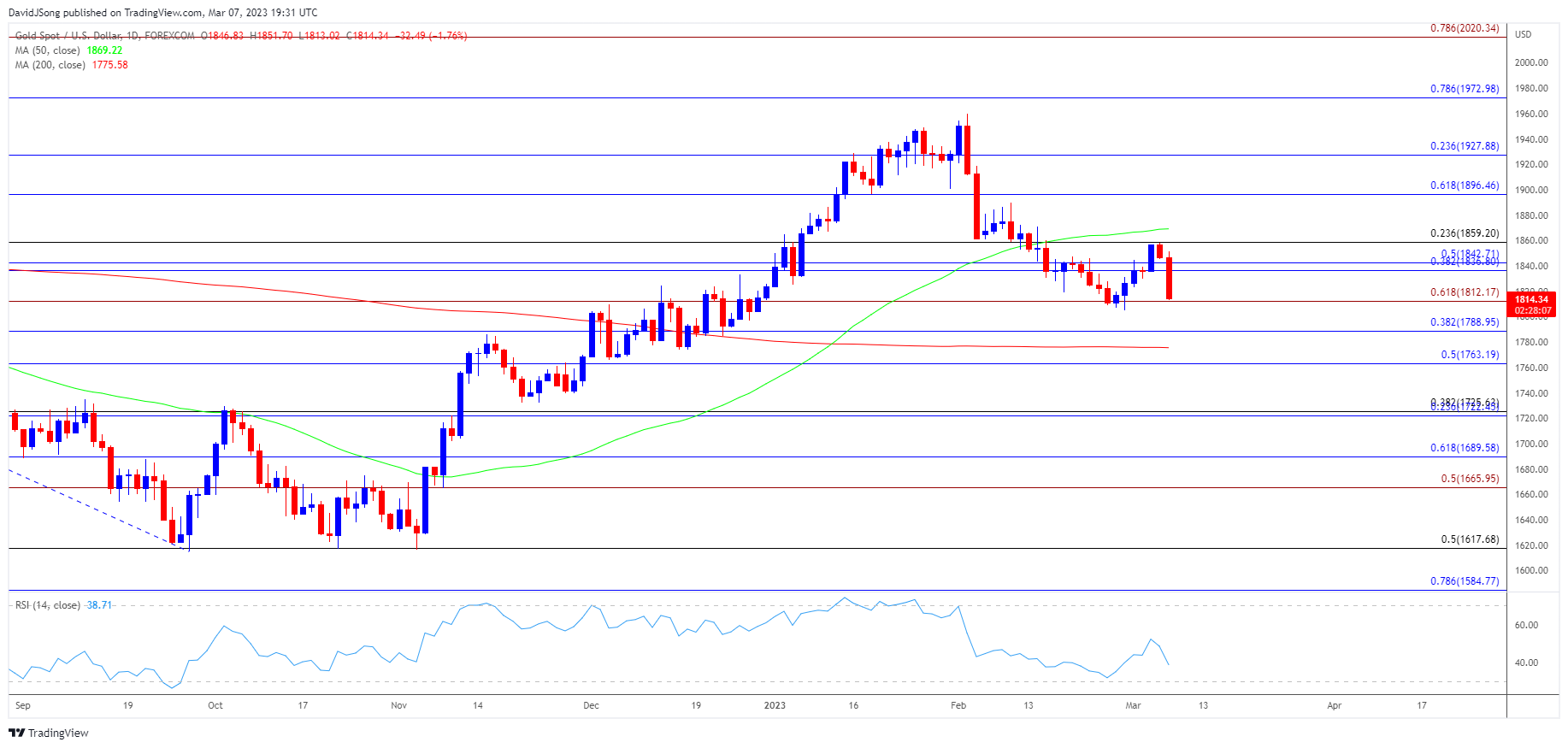 金价不再沿着移动平均线的正斜率,因为它未能回到移动平均线上方,该贵金属可能会继续下跌,创下月内新低,因为美联储主席杰罗姆·鲍威尔最近的言论加剧了对美国加息的猜测。