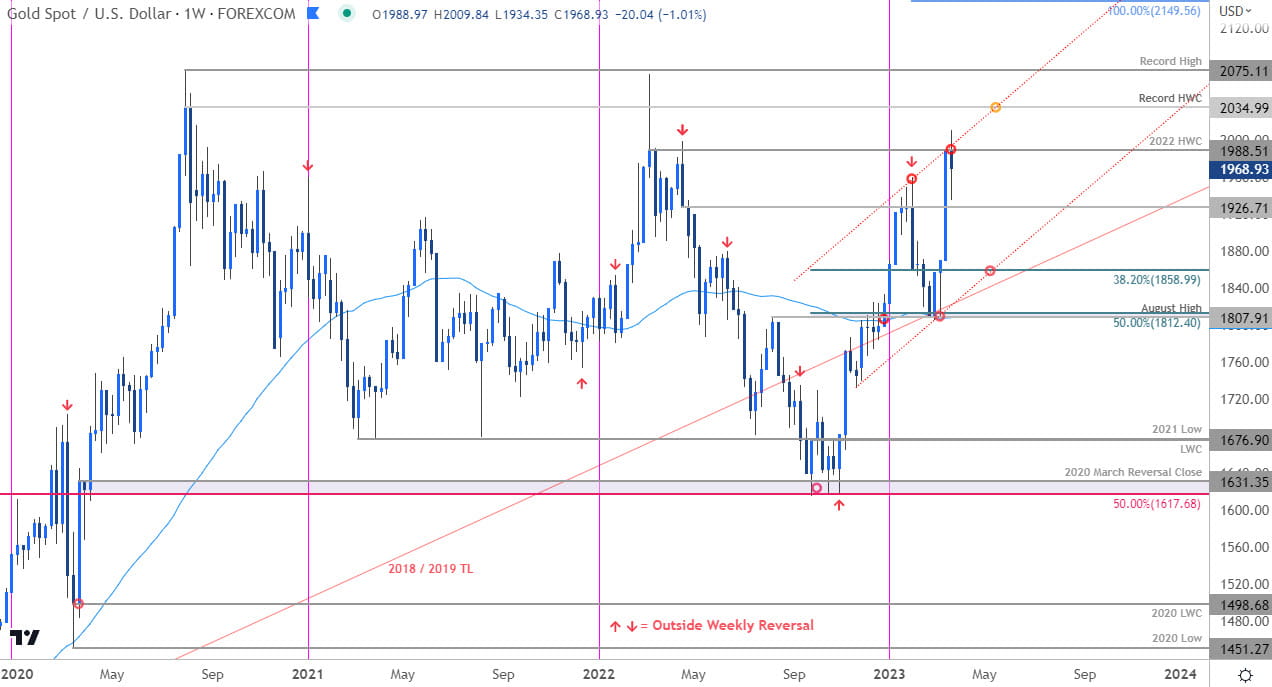 上破/收于上平行线(红色)上方可能会推动另一次加速反弹,迈向创纪录的周线高位收盘价2034和历史高点2075。