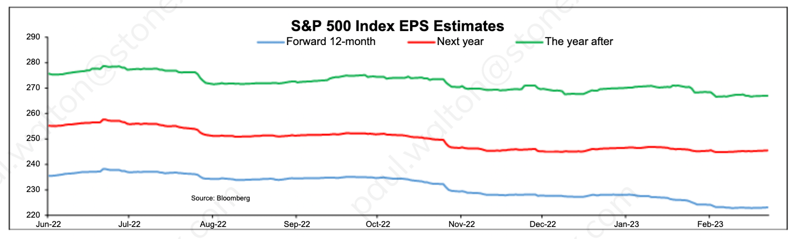 每股收益(EPS)预期不断下调:分析师现在预计2023年每股收益为223美元,与去年持平。他们开始下调对2024年和2025年的预测,预测增长率分别调为10%20%,但还远远不够。供您参考,15倍每股收益为220,可以得出标准普尔500指数的目标价格为3,300,比当前水平低17%