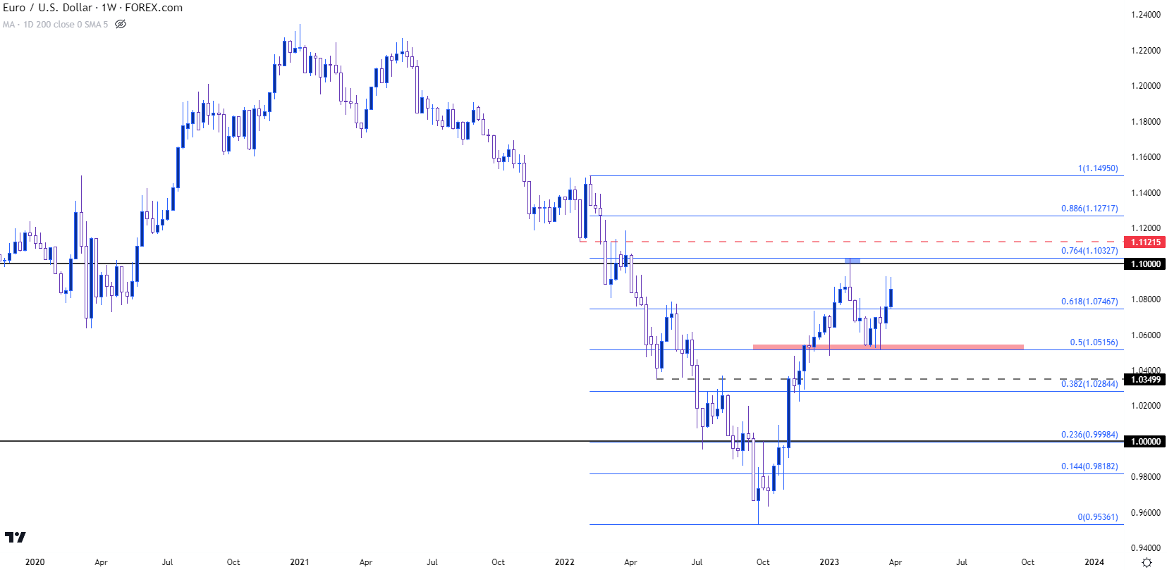虽然2023年的第一周走势坎坷,但欧元/美元在1.0500附近获得支撑,随后非常糟糕的服务业PMI报告推动美元再次走弱。这使得欧元/美元延续涨势,最终在2月初触及阻力位1.1033。这是从去年2月到9月低点的主要走势的76.4%斐波那契回撤位,价格在此处遇阻后,空头接管了接下来六周的大部分时间,直到另一个支撑位出现。