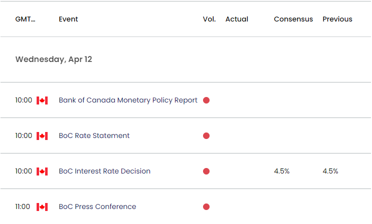 相比之下,预计加拿大央行将把基准利率维持在4.50%,因为“最新数据仍符合央行对今年年中CPI通胀率将降至3%左右的预期。行长蒂夫·迈克勒姆及其同僚承诺“会评估经济发展和之前加息的影响”,加拿大央行不变的立场可能会利空加元。
