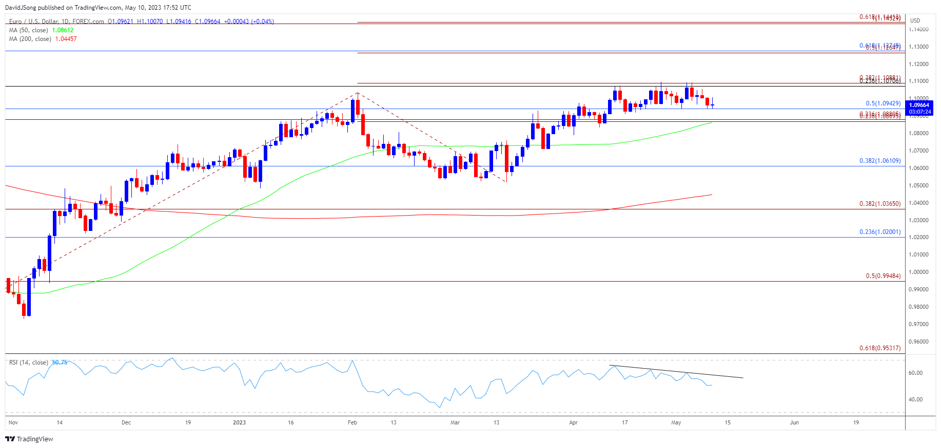 欧元/美元目前正在逼近5月开盘区间内的月线新低(1.0941),但如果它跟随50日均线(1.0862)上行,则近期汇率的反弹可能会进一步测试4月高点(1.1096)。
