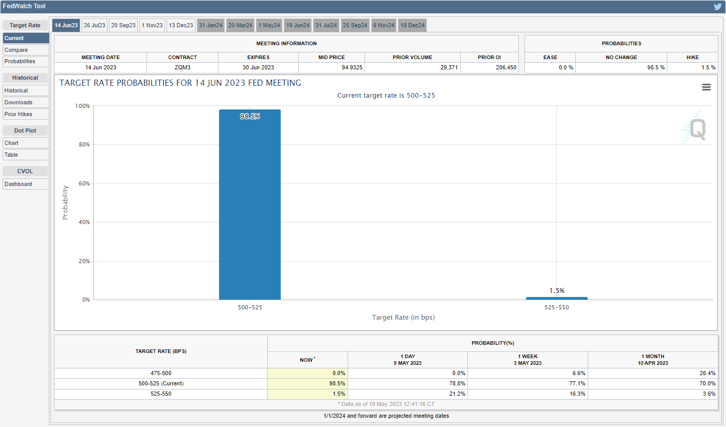 根据CME FedWatch Tool的数据,市场参与者预计联邦公开市场委员会(FOMC)将基准利率维持在当前5.00%5.25%区间内的概率大于90%,随着美联储将要发布更新后的经济预测摘要(SEP),主席杰罗姆·鲍威尔及其同僚是否会在614日进一步调整前瞻性指引还有待观察。