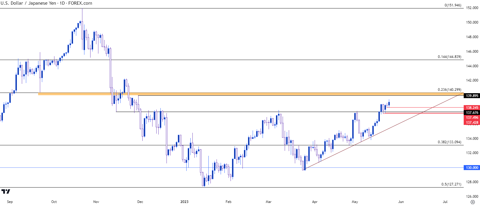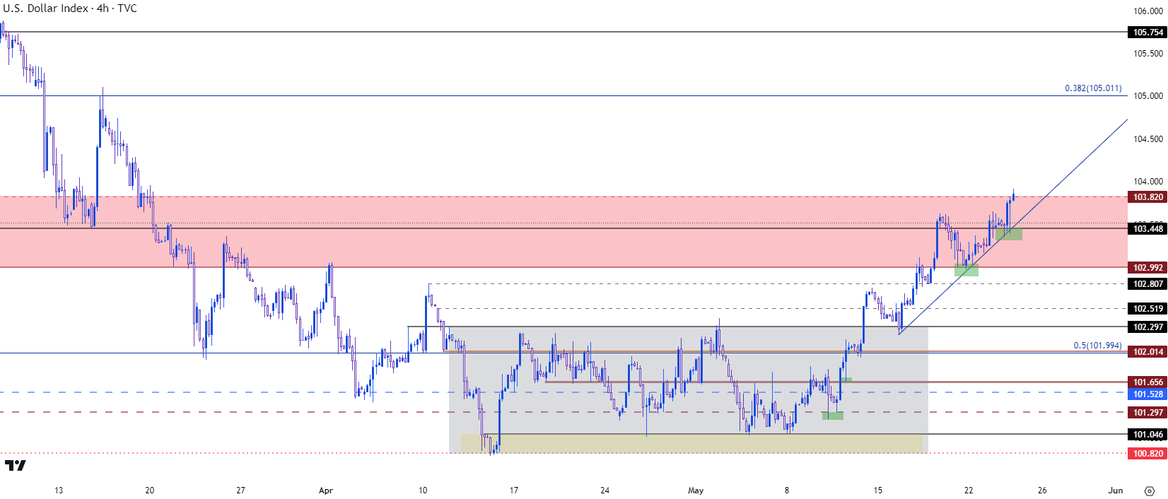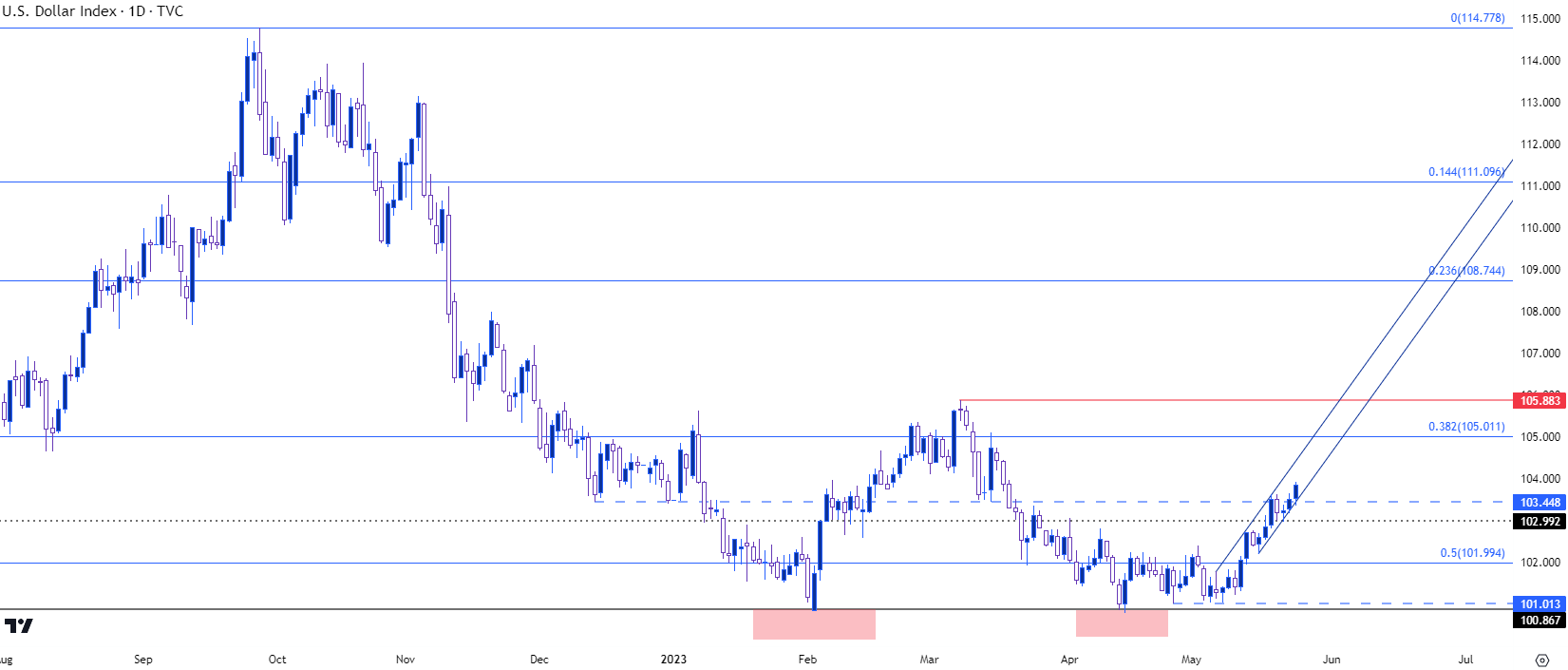 再看日线图,2023年初截至目前,美元的价格行动基本维持在同一个区间内。103.45是关键位,在多个不同情况下都发挥支撑位作用,但更大的焦点是区间阻力,并开始在美元指数的105.00附近显现。