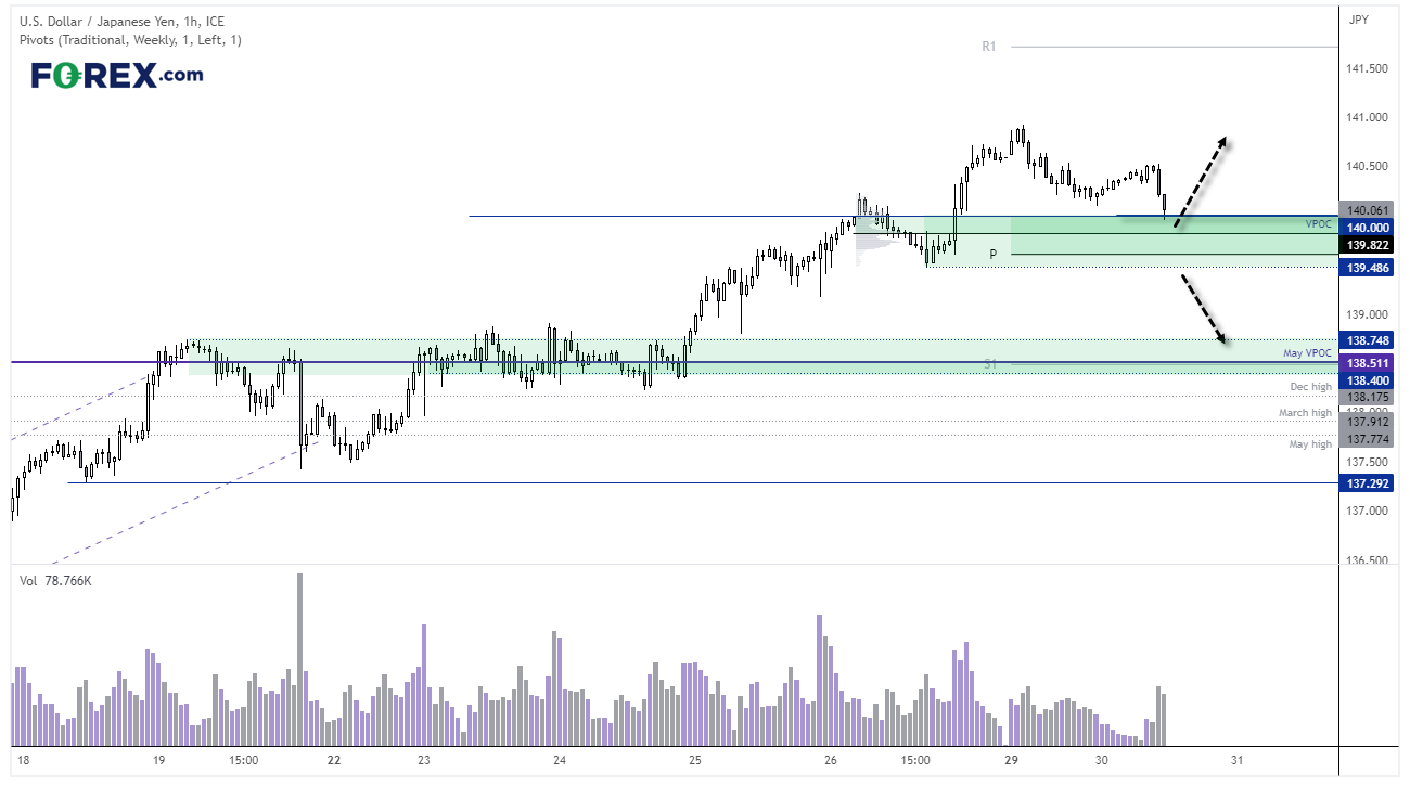 价格在1小时图上继续回调,成交量重新增加,这表明存在大资金主动抛售。然而,140(不错的整数)正在提供支撑,并保持在139.82上方,这是周五回调期间的最高价。我们还有周线枢轴点139.16和低点139.48,因此出现波段低点的可能性看来相对较高。我们不太确定的是,它是否会随趋势突破至新高,还是做做样子而已。