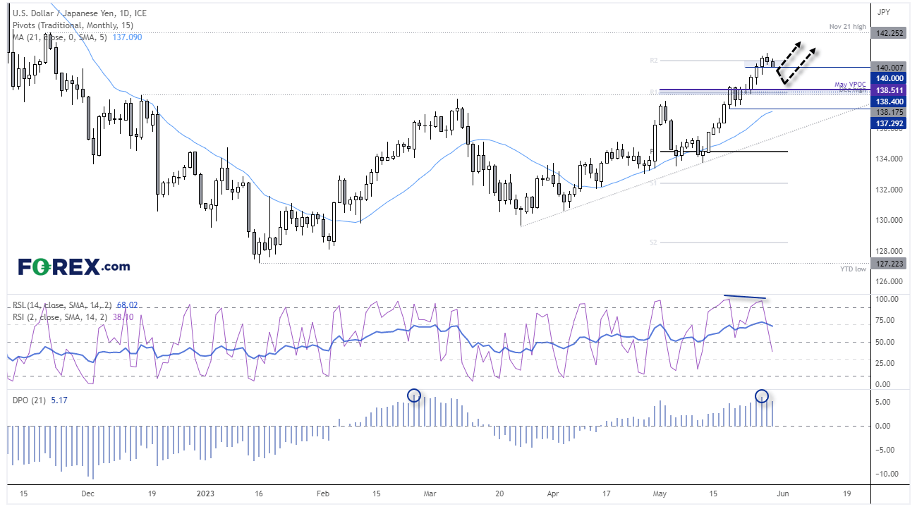 我们普遍认可美元/日元在日线图上产生了不错的趋势,这要归功于顽固的极端鸽派日本央行、更强劲的美国经济数据以及美联储实际上有可能在6月再次加息25个基点的新猜测。美元/日元周一创下年初至今的新高,然后在低流动性交易期间转跌,美元的涨势暂缓。在撰写本文时,价格现在正在试探140,我们只会考虑其更深回撤的可能性。