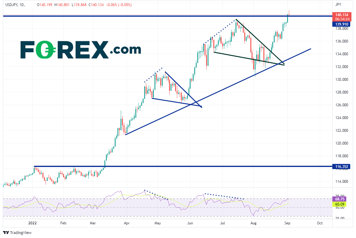 美元/日元继311日站上水平阻力位116.35以来不断走高,在通胀继续上升且美联储必须大举加息的事实明朗之后,涨势贯穿春夏两季。美元/日元两次创下趋势新高后修正并形成下降楔形,都在价格逼近楔形尖端时突破并延续涨势,收复100%的楔形。美元/日元周四创下19988月以来最高点140.23,周五继续冲高,创下140.80新高。但美元在非农就业报告公布后涌现的获利回吐盘带动下开始回落,如果基本收平于140.20附近,货币对或形成射日之星形态,那是预示后市可能修正的形态。