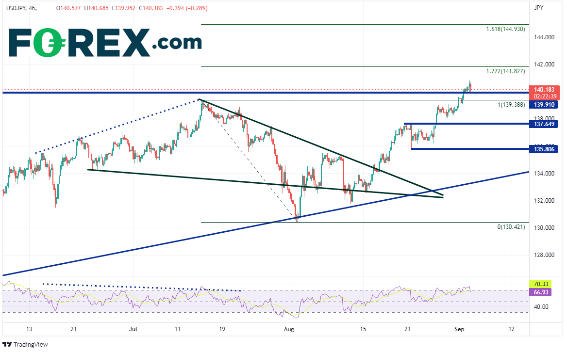 周五的非农就业读数基本符合预期,但失业率高于预期,很可能是因为劳动参与率的上升。该报告似乎不影响美联储的想法,下次会议是加息50还是75个基点依然没有定论。美元/日元目前可能处于修正行情,等待将于913日公布的CPI报告。