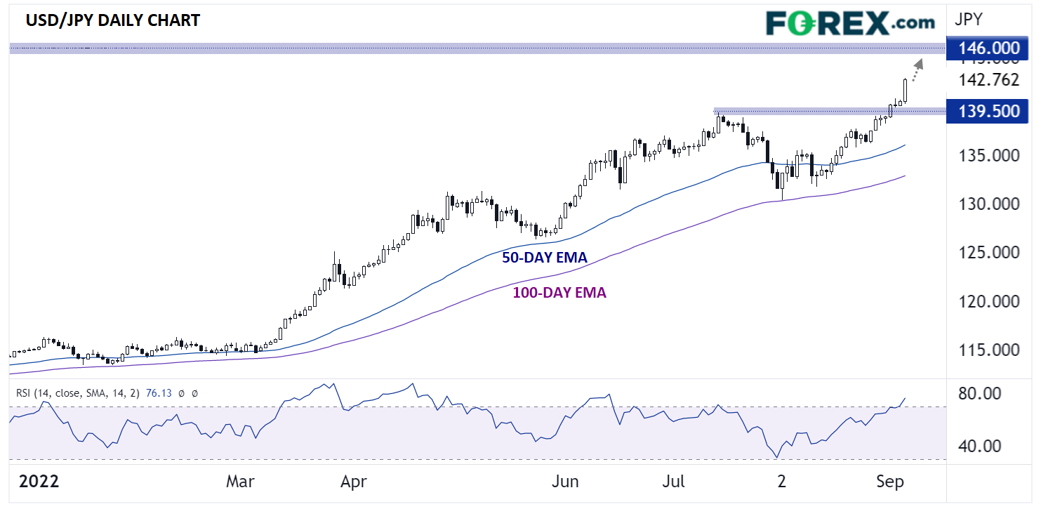 美元/日元图表回撤后8月上半月一直围绕着50天指数移动均线盘整,之后干脆利落地站上140.00下方不远处的今夏高点。现在看来,前阻力位很少,直到146.00区域开始往上的1998年高点: