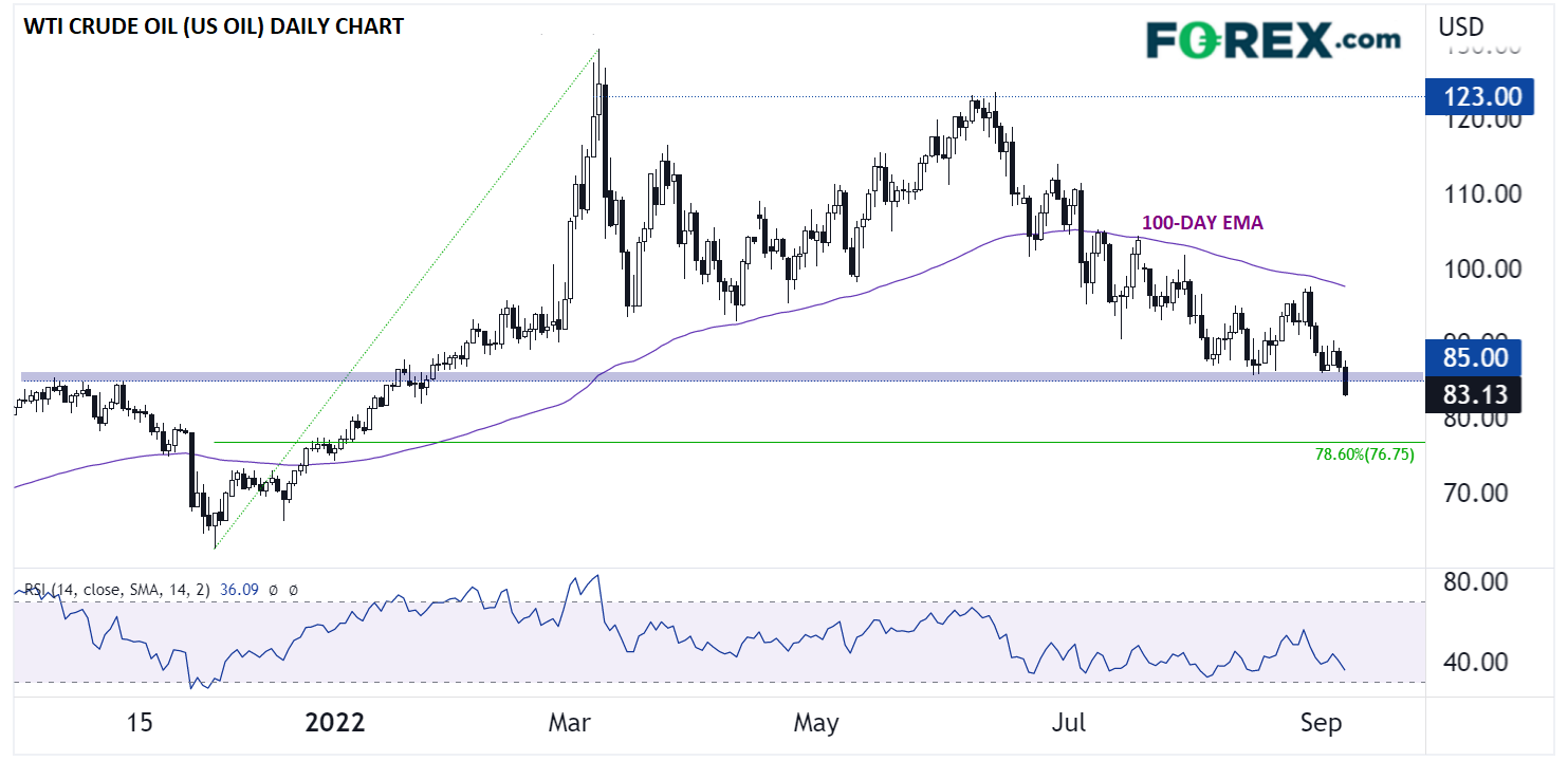 如上所述,油价下破85.00支撑位,跌至近8个月最低点。油价在其下降的100天指数移动均线下方形成系列明显下降的高点和低点,表明过去几个月趋势明显向下。但即使价格创下新低,14RSI并未进入超卖区域,表明价格或许还有下行空间,然后技术抛压才可能有所缓和。