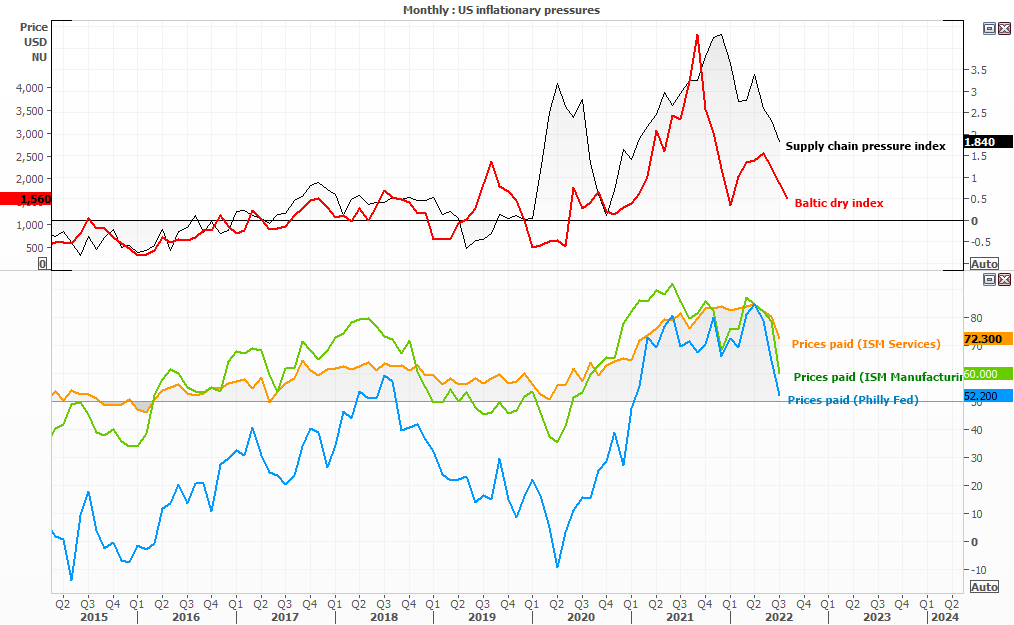 美国PMI报告也明显呈现了通胀压力降低的鼓舞人心的信号,即ISM制造业的“物价支付”分项指标跌至23个月低点,服务业同类指标跌至29个月低点;费城联储物价支付指标跌至30个月低点。采购经理人对商品的支付价格下跌,会沿着供应链传导,进一步缓解物价压力。