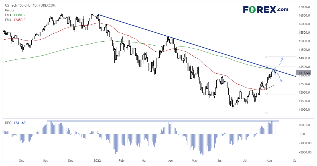 纯以技术面的角度看,纳斯达克100指数可能处当前高点展开均值回归。股指相较6月低点反弹了20%以上,但在200天指数移动均线和下降趋势线处遇阻。而且,13,500上方不远处就是月图第一中枢阻力。衡量价格与其21期均线之间距离的区间震荡指标(DPO),上升至历史阻力位水平,暗示价格可能展开均值回归走势。价格昨天形成了看跌Pinbar,我们现在预计价格筑顶后回落。下破13,000,则延续下跌可期。
