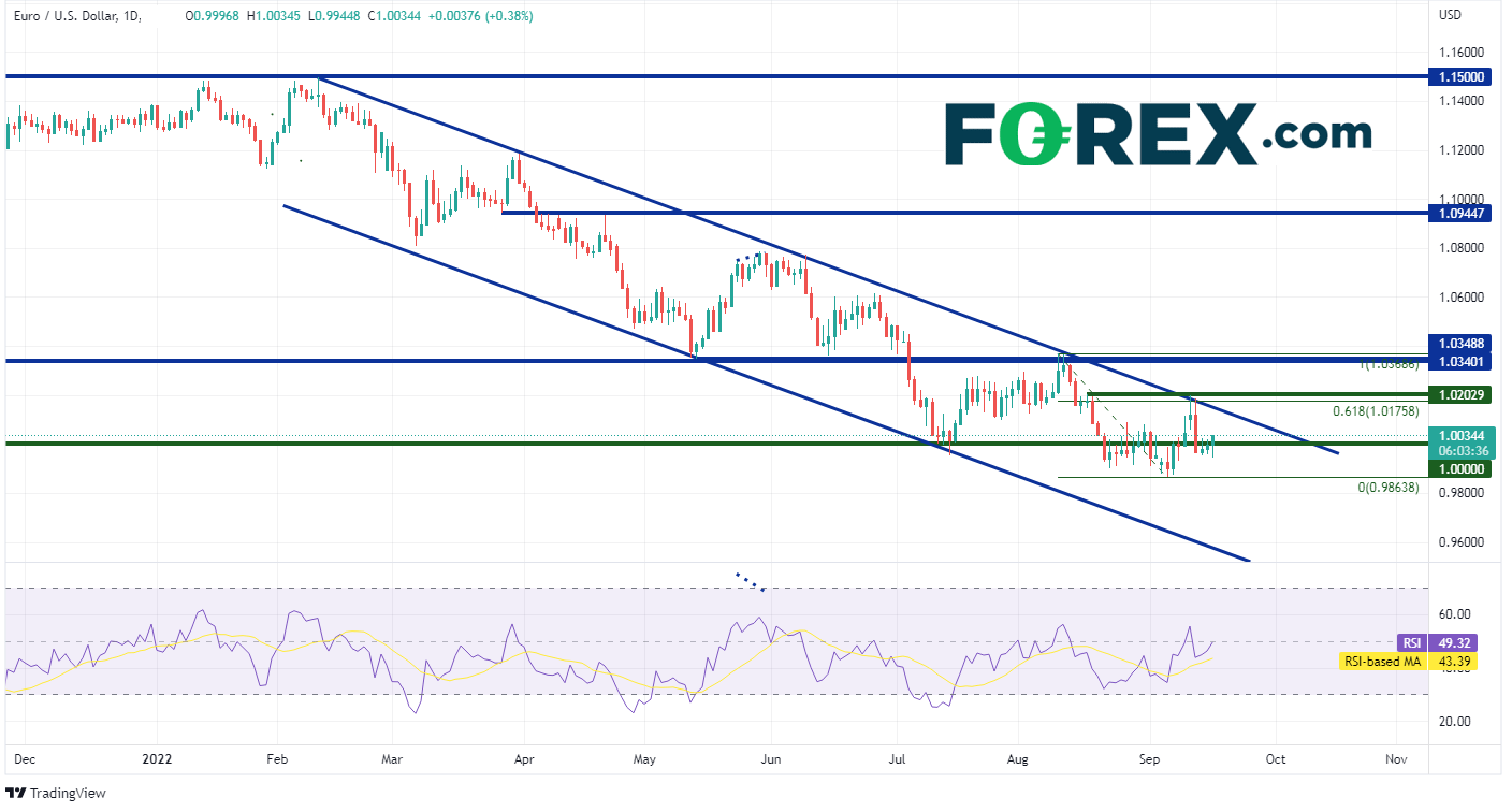 欧元/美元日图一直交投于2022年2月10日高点1.1498以来的下降通道内,下破1.0000并考验通道下轨趋势线支撑位之后,反击通道上轨趋势线所在的强水平阻力位1.0340附近。自那以后,货币对不断下跌并在0.9864创下20年低点。价格之后回升至8月10日高点到9月6日低点行情的61.8%回档位,即1.0176附近(那也是通道上轨趋势线所在)。欧元/美元回升后再度回撤,于9月13日回到平价,此后围绕该位震荡。