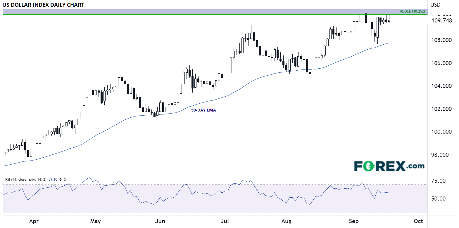 外汇市场明显继续做多美元(并不是说一定成功)。美元指数继续守住上翘的50天指数移动均线,天平仍在多头这边。此文发稿时,美元指数正在测试2001-2008年大跌行情的78.6%回档位,即110.25附近。但如果美联储届时的立场比预期强硬,可能推动美元指数突破并收上前述区域,10月前剑指112.00或更高的价位。