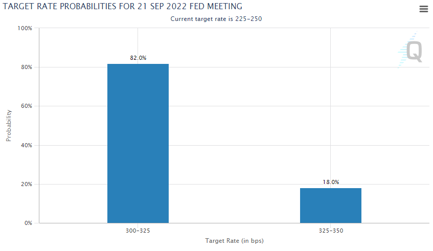 根据CME的美联储观察工具,交易员及经济学家计入84%左右的几率届时加息75个基点,至3.00%-3.25%区间,及16%左右较小的可能性加息100个基点。