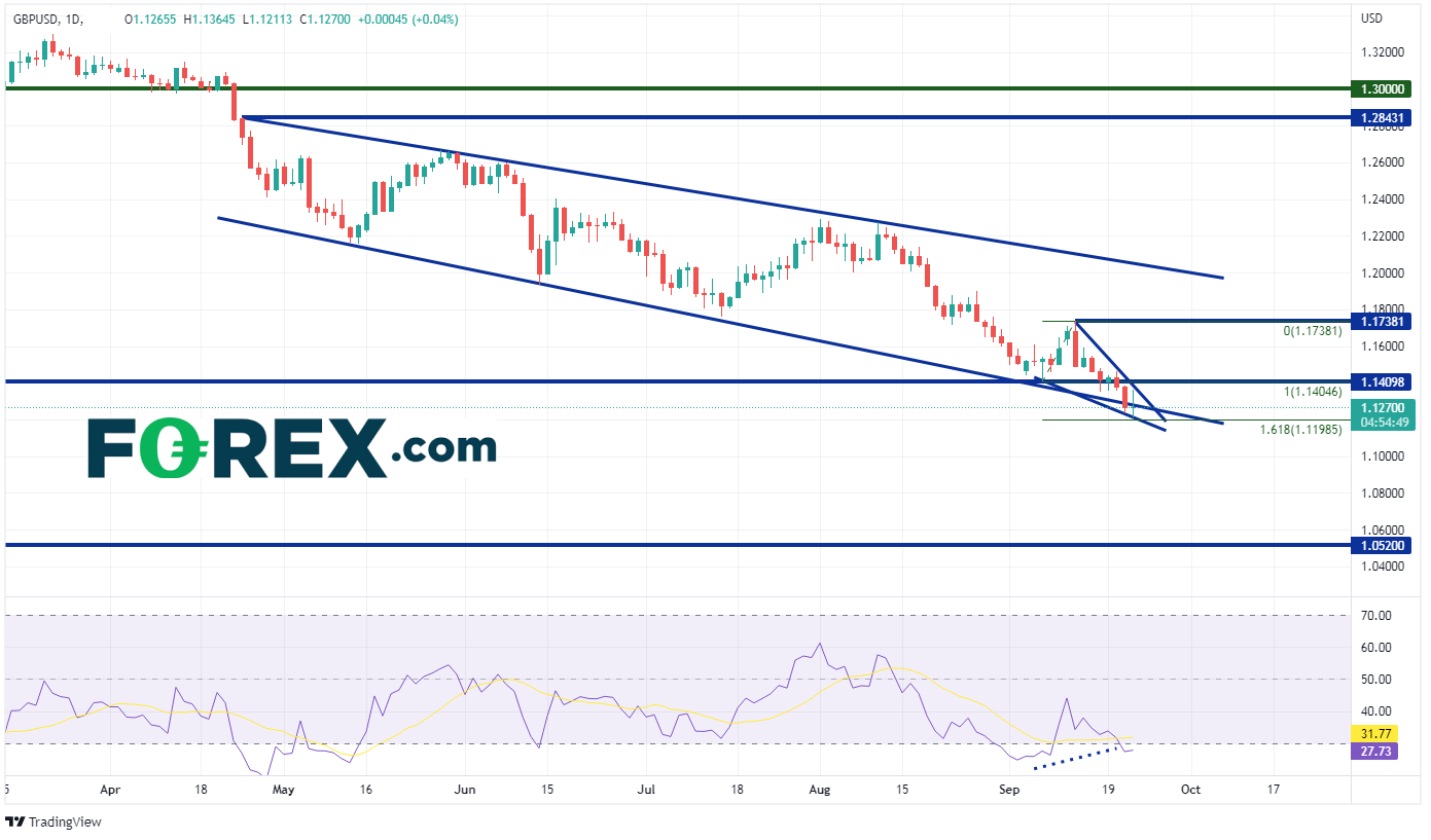 将英国的情况和美国的情况对比后我们认为,英镑/美元或许继续下跌。美国正在积极加息(FOMC昨天加息75个基点)且无惧经济衰退(严格来说美国经历了两个负增长期间,但美联储并不认为那是衰退),英国央行加息力度偏弱且担心经济业已衰退。在这样的背景下,英镑/美元不断走弱,日图自4月底到达1.2843附近以来形成了下降通道,在周三FOMC决定出炉后考验了通道下轨趋势线并在1.1235创下37年新低。另外,价格形成了下降楔形,周四也交投于其内。英镑/美元当天在1.1211形成下降的低点,但从楔形下轨趋势线回升。