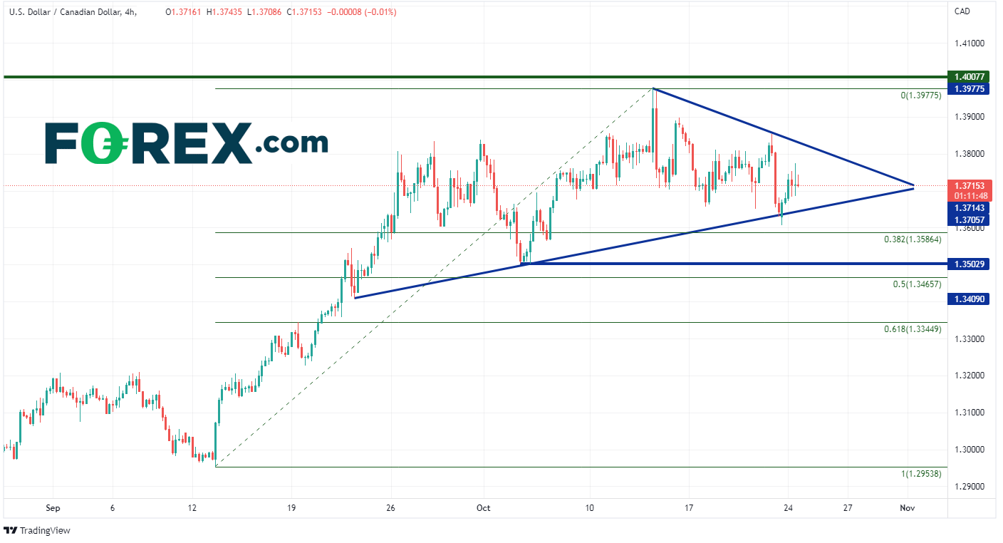 美元/加元从4月初以来一直沿着上行通道移动。921日,该货币对突破顶部,通道上轨接近1.3400并继续攀升。随后在1013日达到高点1.3978RSI指数和交投价背离。随后,货币对小幅回撤,目前在1.3700附近交投。
