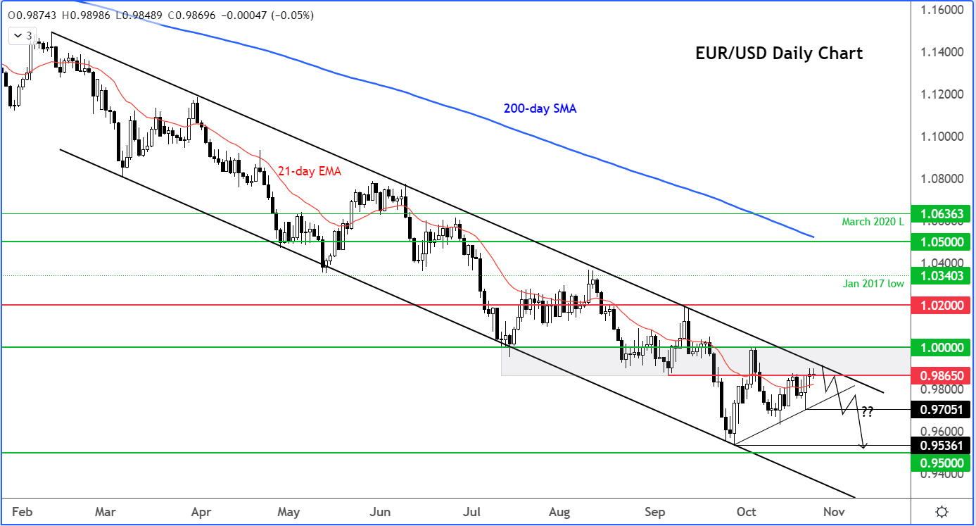 由于市场已完全计入加息75个基点的预期,欧洲央行要出其不意地发布鹰派决定,才能推动欧元/美元大幅走高。但鉴于欧元区经济日益疲软,这种情况不太可能发生。 与此同时,由于美联储在下周的FOMC会议前鹰派口风不动摇,美元也不可能持续走弱。所以欧洲央行利率决议可能只会短暂影响欧元/美元走势。欧洲主要股指也不太可能获得重要支撑,因为投资者仍然聚焦滞胀迹象和全球央行紧缩政策。